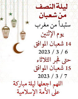 ليلة النصف من شعبان ستبدأ من مغرب يوم الأثنين 14 شعبان الموافق 6/3/2023 حتى فجر الثلاثاء 15 شعبان الموافق 7/3/2023